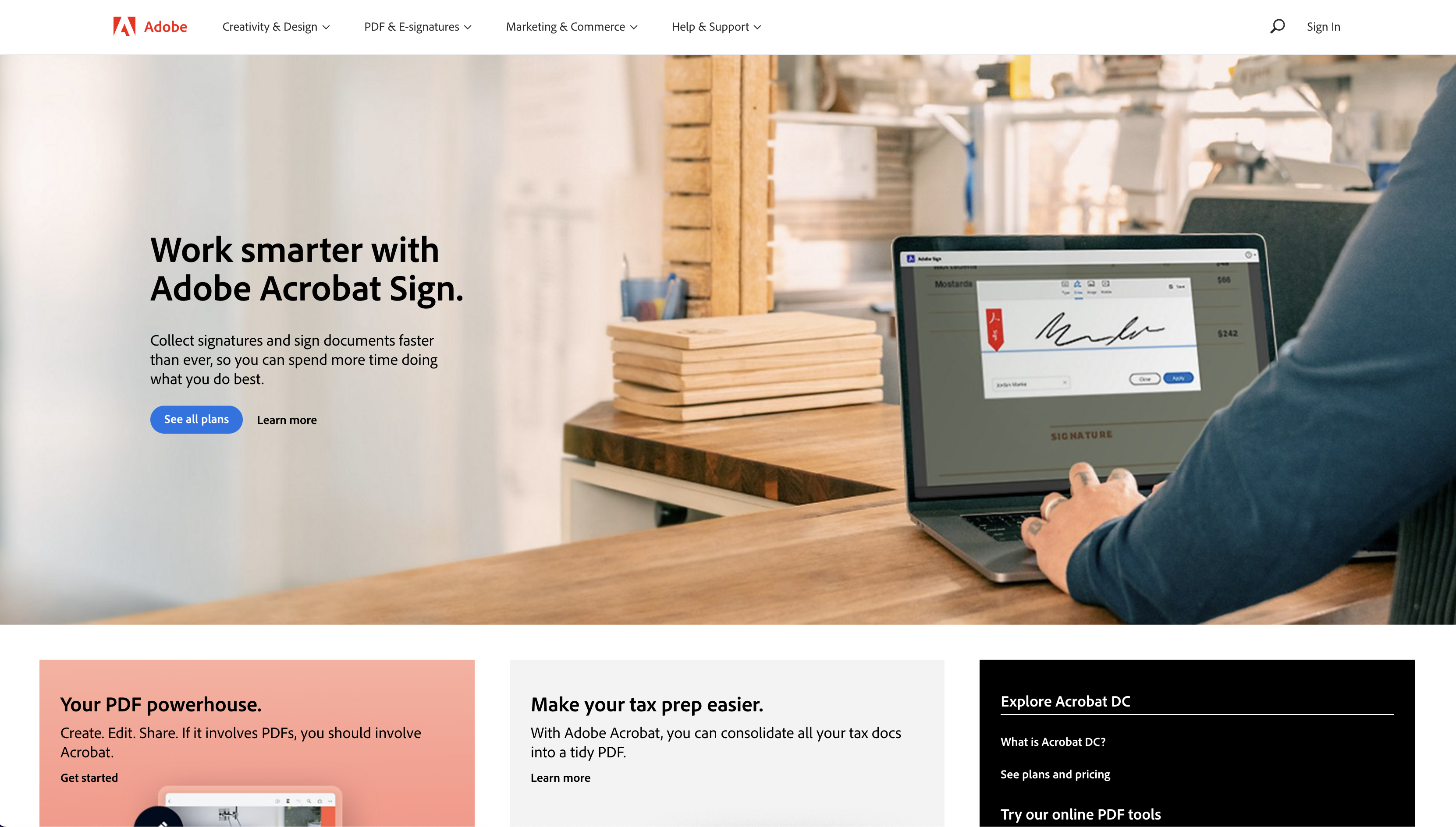 Na página inicial da Adobe provavelmente um dos primeiros textos que lemos é "Work smarter with Adobe Acrobat Sign." Além de sua posição relativamente central, ele atrai o olhar por utilizar uma fonte em negrito e consideravelmente maior do que os outros textos. O botão "See all plans" também chama mais a atenção do que o botão logo à sua direita com o texto "Learn more", pois a cor azul e a borda tem maior contraste com o fundo.