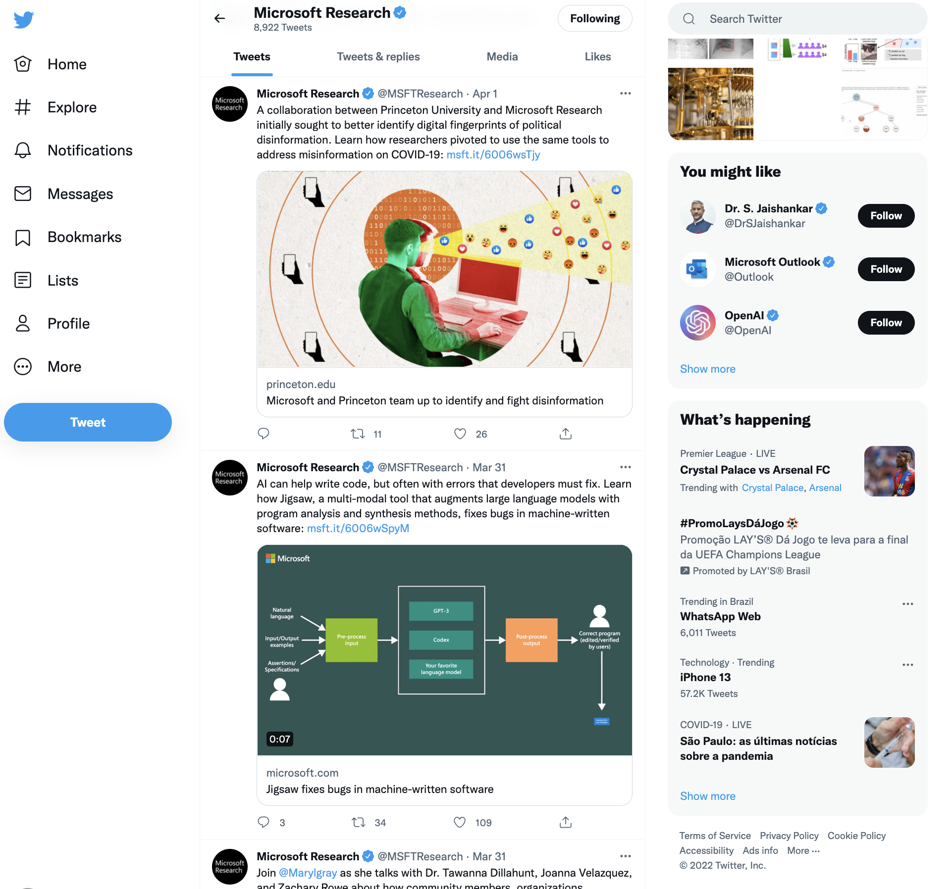 No exemplo acima, há uma repetição de um padrão para definir os tuítes: a imagem do perfil em um círculo na esquerda, o nome da conta em negrito, seguida pelo nome de usuário com uma fonte mais clara e fina. Abaixo encontramos o conteúdo do tuíte, seguido por alguns botões (comentários, like, etc.). O tuíte é encerrado por uma linha horizontal fina e clara. O próximo tuíte se inicia seguindo exatamente o mesmo padrão. Assim fica claro onde um tuíte termina e outro começa.