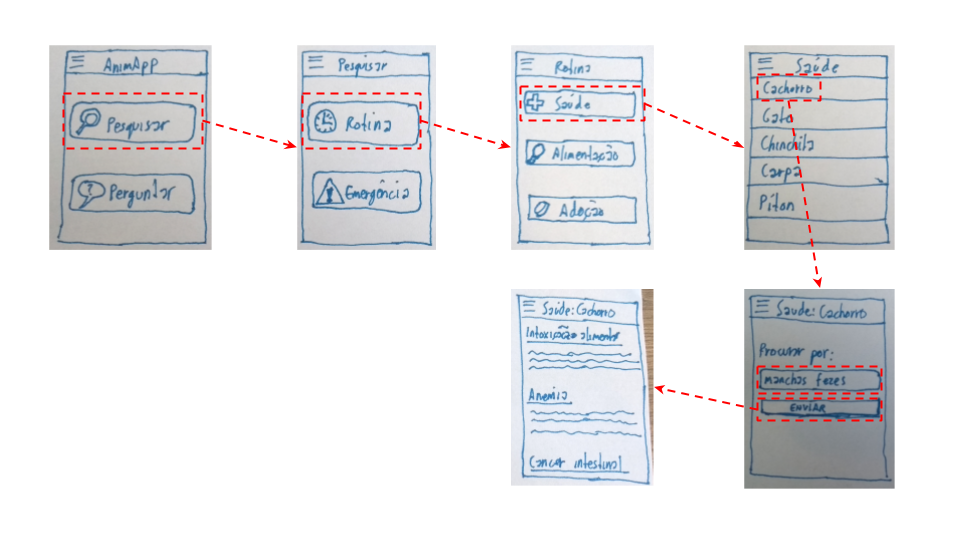 A imagem acima é um possível fluxo de telas para essa tarefa. Além de sketches de todas as telas pelas quais o usuário passa, esse fluxo também usa caixas tracejadas para indicar os botões e caixas de texto com que ele precisa interagir. Também usa setas tracejadas para indicar mudanças de tela causadas por essas interações.