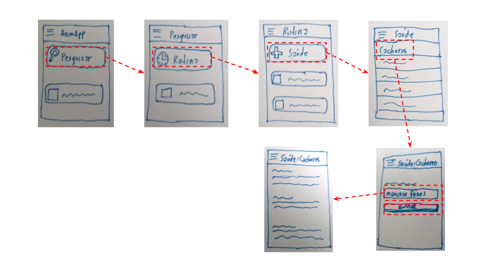Uma entrega com conceito A poderia ser um conjunto com os três fluxos de tela do Exemplo de B e sketches que cobrem as telas não envolvidas nesses fluxos. Por exemplo, as telas de Alimentação e Adoção que podem ser acessadas a partir da tela de Rotina.