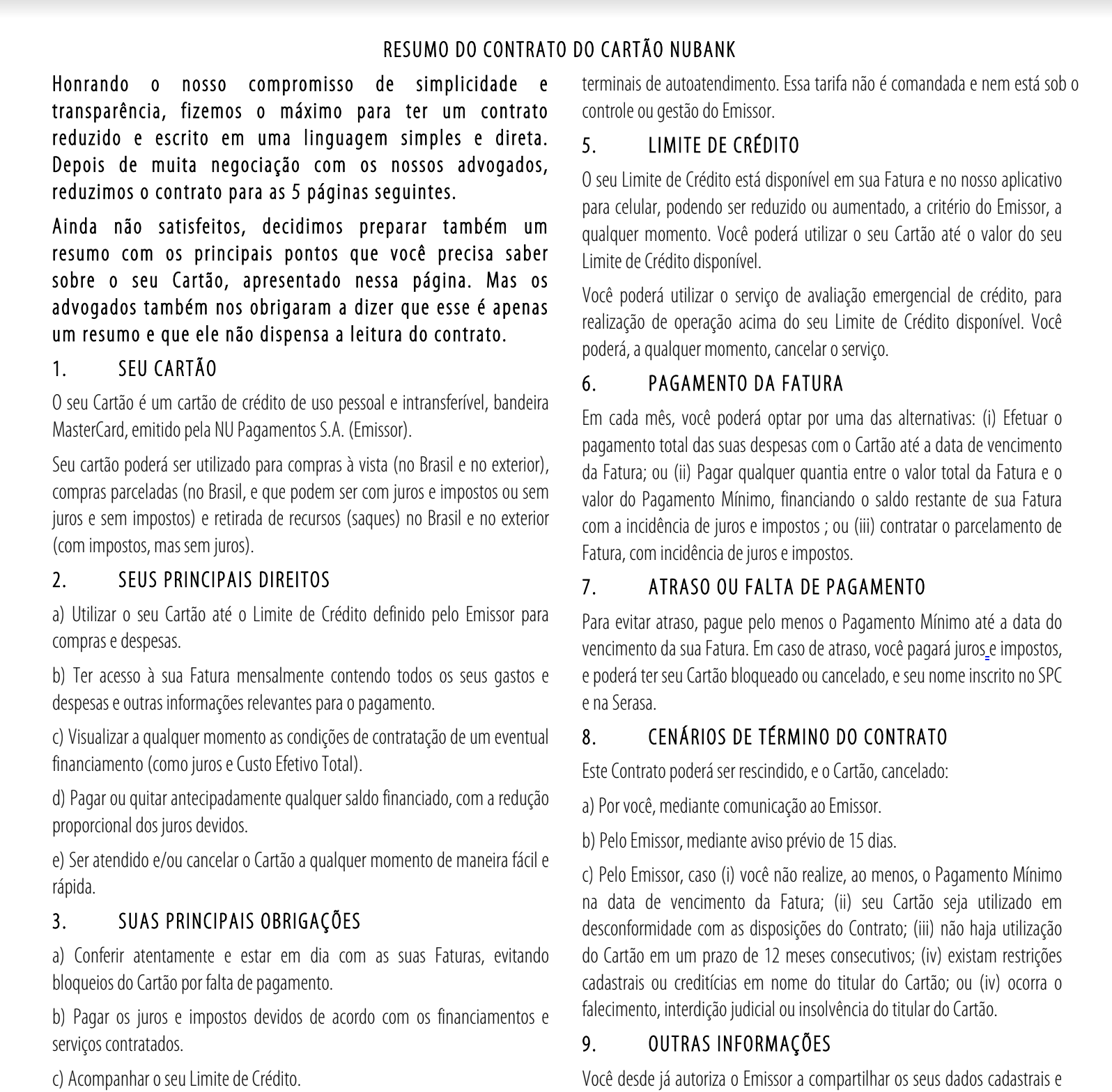 A abordagem do Nubank foi adicionar uma página inicial com linguagem simplificada e títulos claros: "seus principais direitos", "suas principais obrigações" ao invés de "direitos do contratante" e "deveres do contratante". As páginas seguintes do contrato utilizam a terminologia técnica necessária, mas ao chegar nesse ponto a mensagem principal já foi passada.