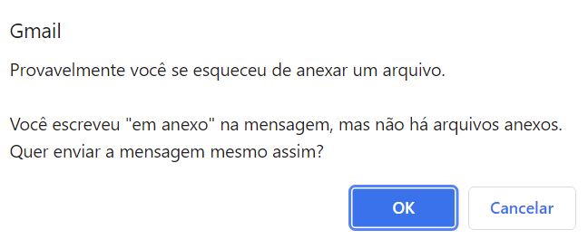 Por ser um erro bastante comum, o Gmail implementou a seguinte funcionalidade. Ao tentar enviar um email com alguma frase dizendo que está enviando um anexo, se não houver nenhum arquivo anexo o envio é interrompido pela mensagem abaixo: