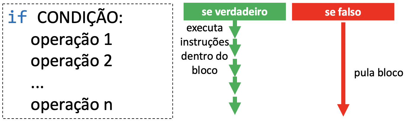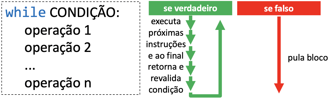 if executa o bloco se a condição for verdadeiraO while funciona de maneira similar, mas ao final da execução do bloco, a condição é reavaliada e, caso seja verdadeira, o bloco é executado novamente enquanto a condição for verdadeira: