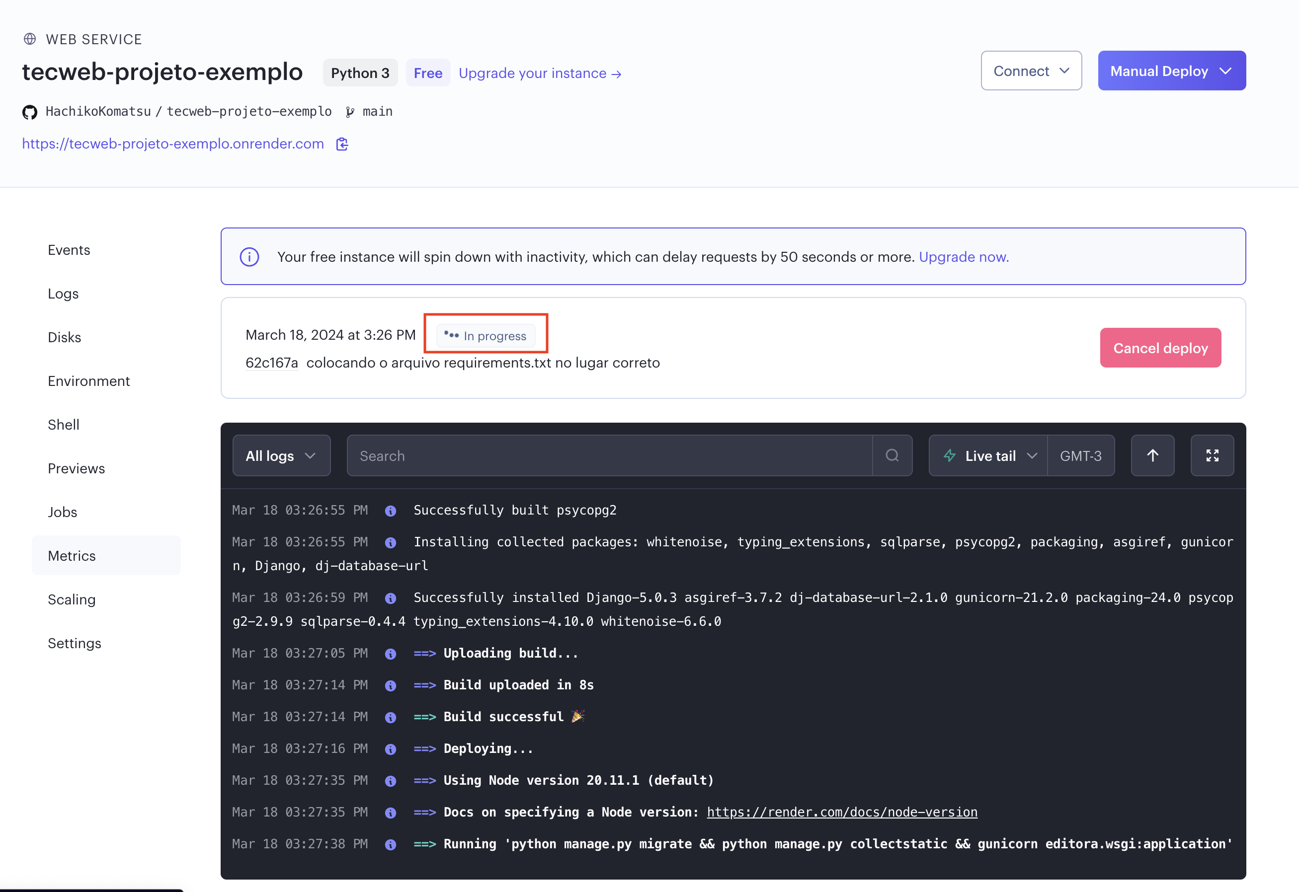 requirements.txtcom muitas dependências desnecessárias. - Caso o projeto esteja dentro de uma pasta é necessário alterar as configurações do Render para que ele consiga encontrar os arquivos do projeto.