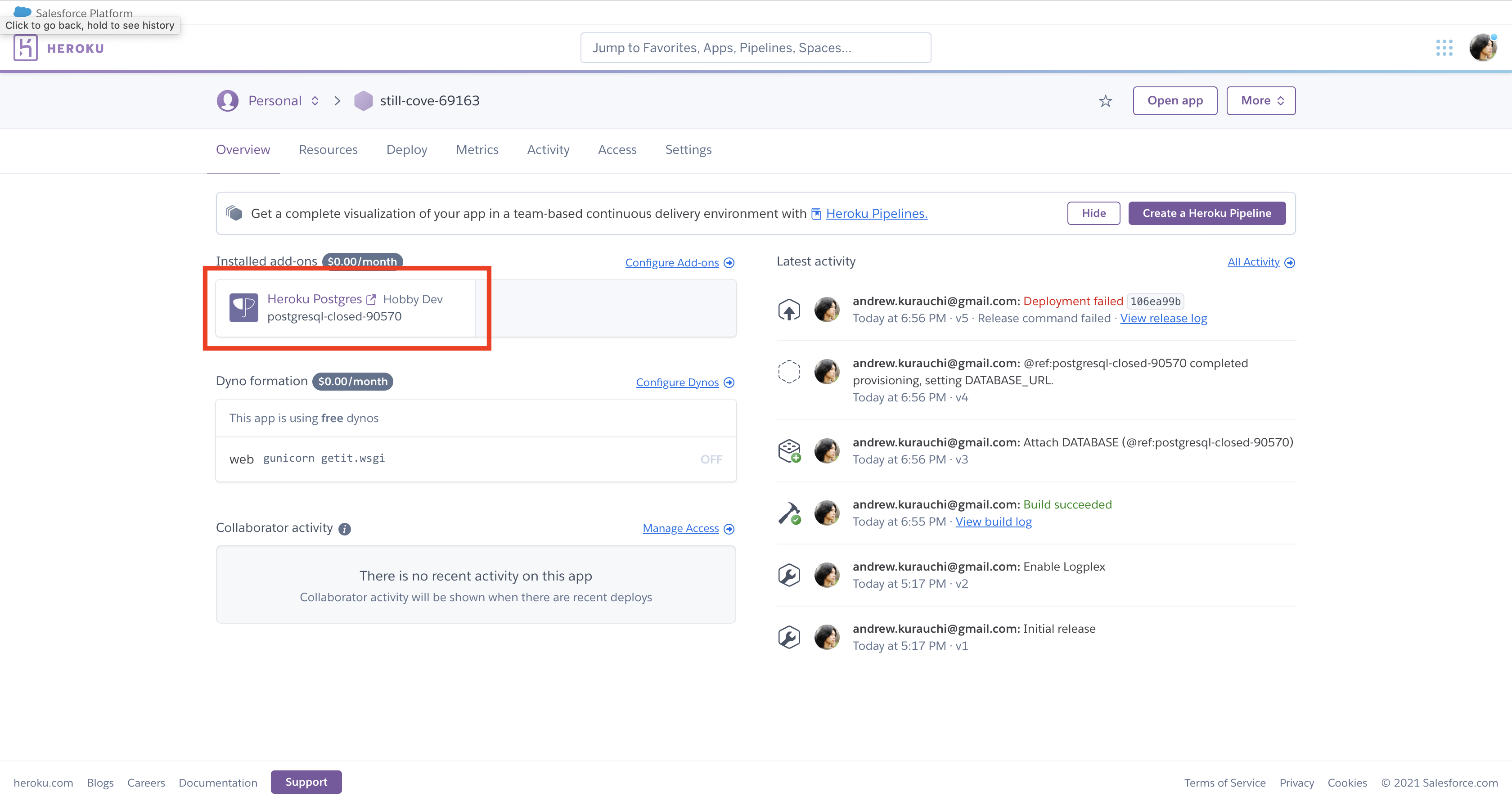 Agora que você fez o primeiro deploy o Heroku identificou que você está publicando uma aplicação Django. Assim, ele já disponibiliza uma instância do Postgres para você! Acesse a sua aplicação no dashboard do Heroku e o Postgres deve aparecer nos add-ons instalados: