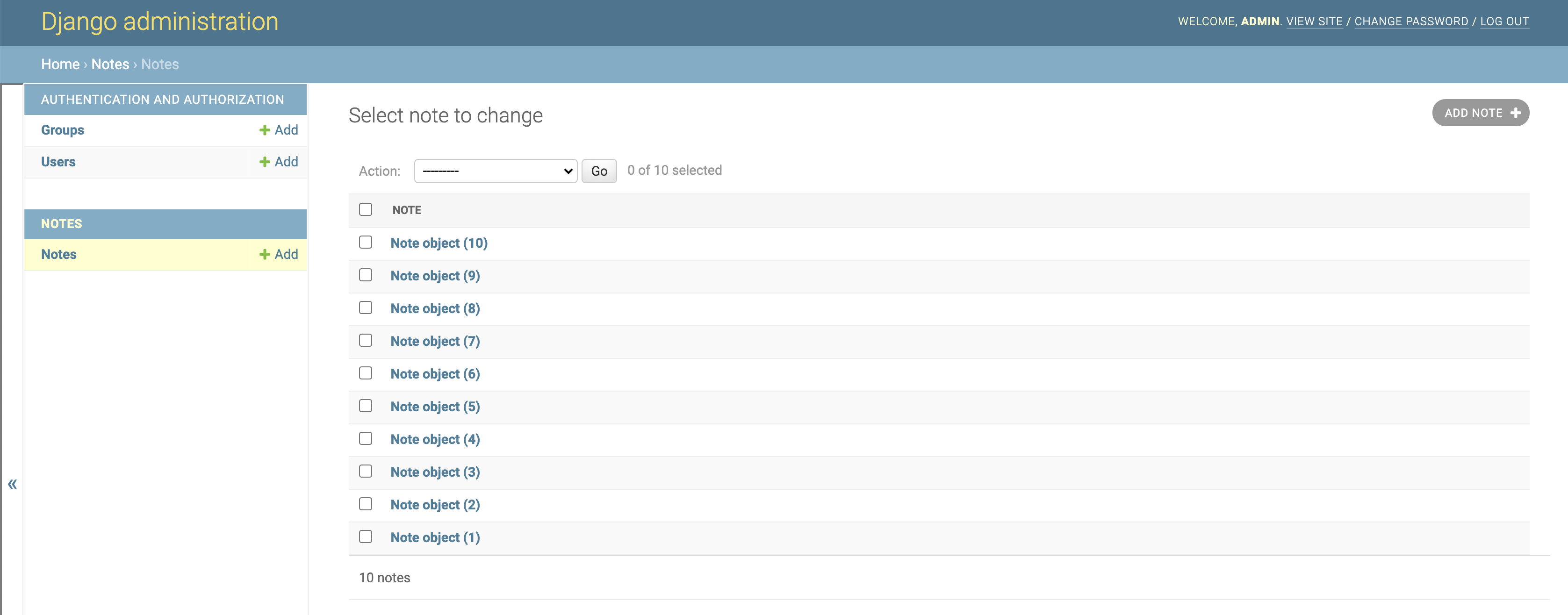 Não sei para você, mas para mim esses nomes Note object (x) não parecem muito úteis. Seria melhor se ele mostrasse o título da anotação. A boa notícia é que você pode modificar o que aparece na lista da página de admin. Para mostrar um objeto qualquer, por exemplo note, na interface, ele utiliza a função str para transformar o objeto em uma string (str(note)). Nós podemos modificar essa funcionalidade sobrescrevendo o método __str__().