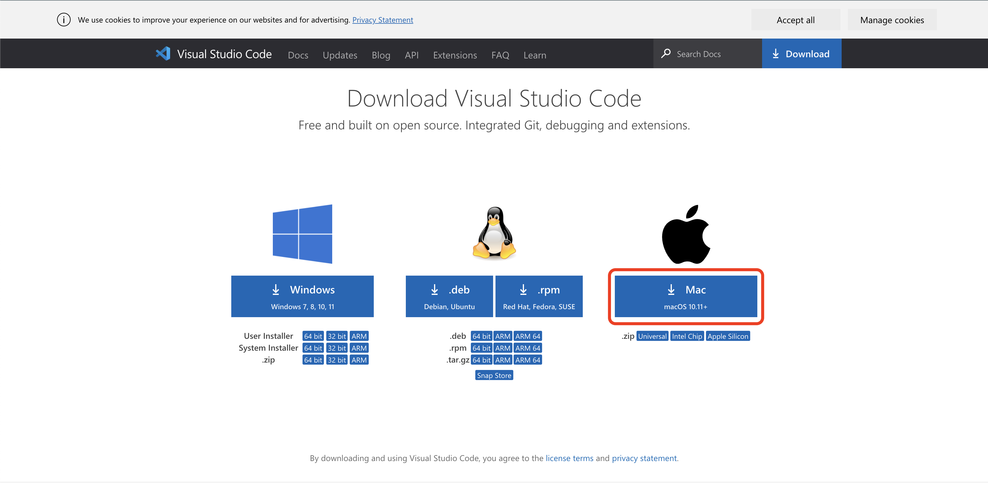Primeiro visite a página de download do Visual Studio Code e clique no link específico para Mac: